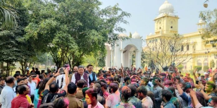 लखनऊ विश्वविद्यालय में होली जोर शोर से चल रही है । आज पूरा दिन विश्वविद्यालय प्रांगण रंगों से नहाया हुआ दिख रहा था । जगह जगह पर होली के कार्यक्रम आयोजित किये जा रहे हैं । उसी कड़ी में आज छात्र कल्याण विभाग व सांस्कृतिकी ने एक सामूहिक आयोजन किया । कार्यक्रम का आयोजन मालवीय भवन के सामने खुले प्रांगण में किया गया कार्यक्रम के मुख्य अतिथि के रूप में कुलपति महोदय उपस्थित रहे साथ ही साथ प्रो पूनम टण्डन अधिष्ठाता छात्र कल्याण विभाग और प्रो राकेश चंद्रा सांस्कृतिकी डायरेक्टर भी उपस्थित रहे ।