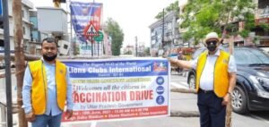 Lucknow. Lions club Lucknow Akanksha Display of publicity banner at Patrakar puram Gomtinagar Lucknow as against State vaccination derive being launched at various locations in the city with special reference to the K D Singh Babu Stadium Lucknow where lions club international Lucknow district 321b1 and its affiliates lions clubs are making /assisting beneficiaries by receiving ,offering bislery water in easing the process of maximum vaccinations. This is a publicity banner activity of lions club Lucknow Akanksha.