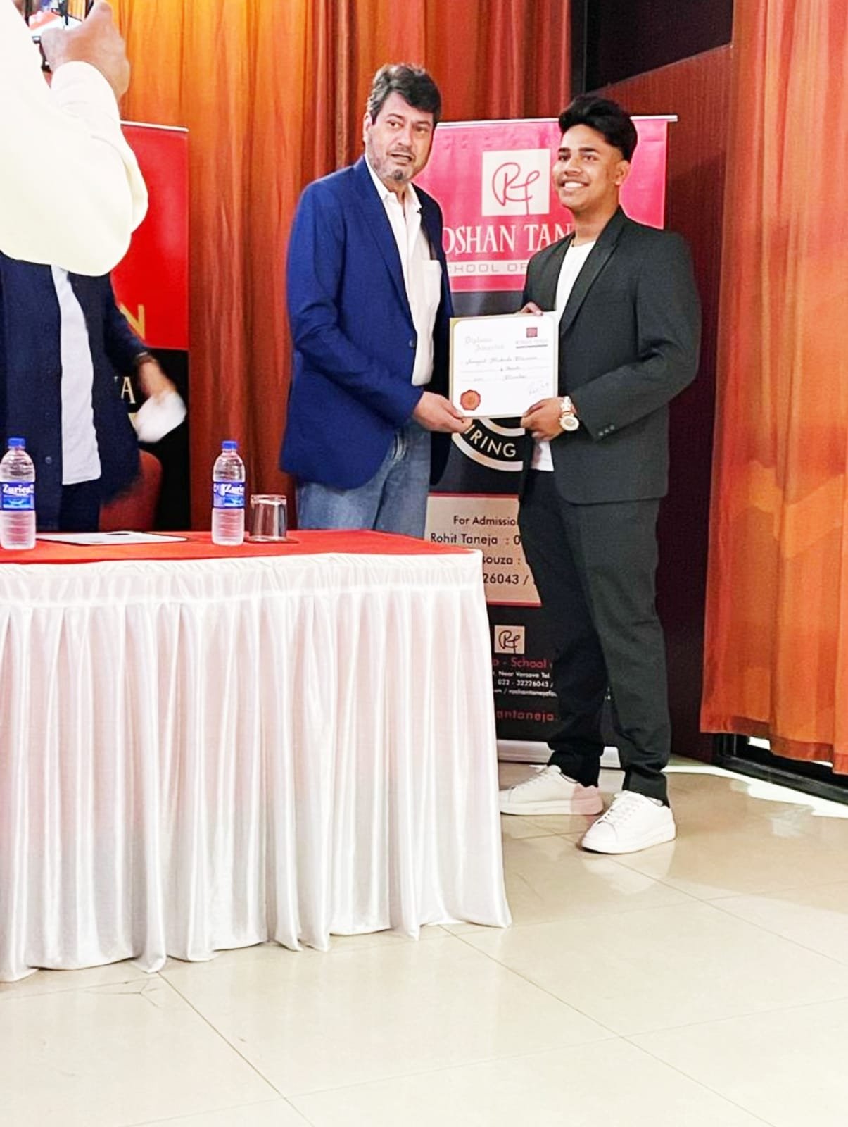 वरिष्ठ पत्रकार और प्रसिद्ध बिजनेसमैन मुकेश कुमार मासूम के चिरंजीव व बहुमुखी प्रतिभा के धनी होनहार कलाकार संगीत मासूम ने रोशन तनेजा स्कूल ऑफ एक्टिंग से डिप्लोमा पूरा कर लिया है । इस अवसर पर मुंबई के अंधेरी स्थित रोशन तनेजा स्कूल ऑफ एक्टिंग कार्यालय में एक शानदार कार्यक्रम आयोजित किया गया । मिथिका तनेजा एवं रोहन तनेजा द्वारा आयोजित इस समारोह में प्रसिद्ध अभिनेता कंवलजीत सिंह ने संगीत मुकेश मासूम को डिप्लोमा सर्टिफिकेट भेंट कर उज्ज्वल भविष्य के लिये शुभकामनाएँ दीं ।
