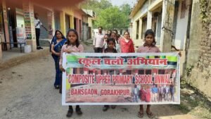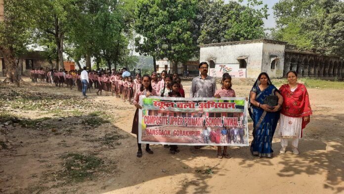 उनवल। खजनी क्षेत्र के कम्पोजिट उच्च प्राथमिक विद्यालय उनवल टेकवार के बच्चों एवं शिक्षकों के द्वारा स्कूल चलो अभियान के अंतर्गत नामांकन में वृद्धि हेतु रैली निकाली गयी ।रैली को वार्ड सभासद संतोष राम त्रिपाठी के द्वारा झंडी दिखाकर रैली को रवाना किया गया ।रैली विद्यालय से शुरू होकर वार्ड नं. 3, टेकवार चौराहा होते हुए झारखंडी शिव मंदिर पर समाप्त हुई ।